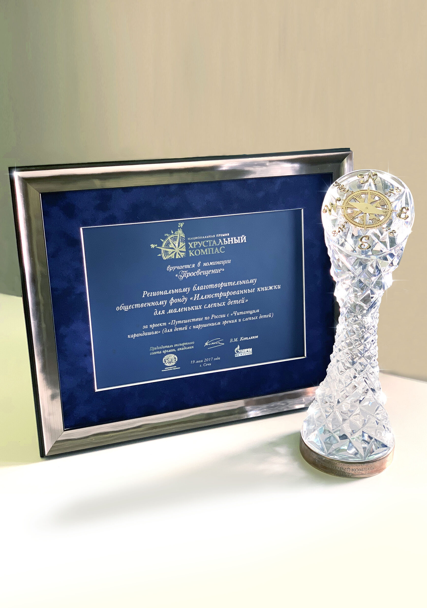 Фонд «Иллюстрированные книжки…» присутствовал на церемонии в качестве гостей – как обладатель «Хрустального компаса» 2017 года в номинации «Просвещение» за комплект «Путешествие по России с «Читающим карандашом»» для детей с нарушениями зрения и слепых детей.